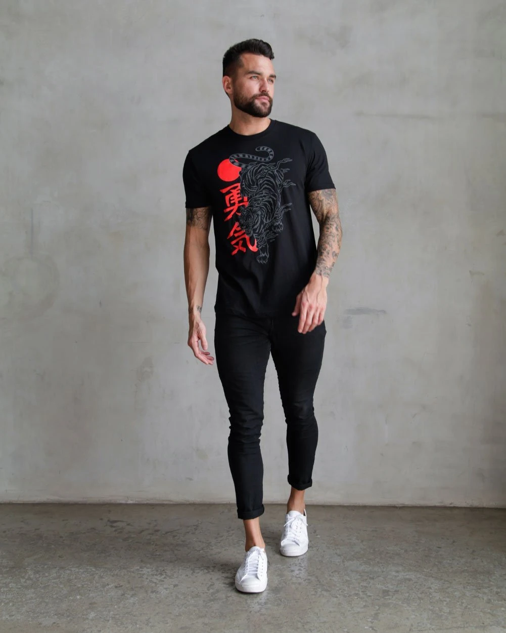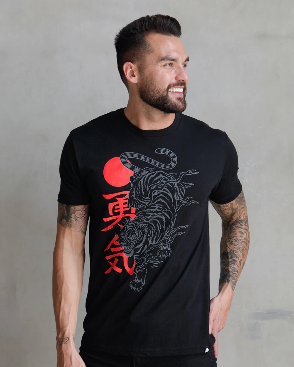 Roaming through the thicket of life’s distractions can make it difficult to lock in on your dreams. Achieving your goals requires perseverance, focus, and courage. So don our reflective Courage tee complete with the word in Japanese and channel your inner tiger.