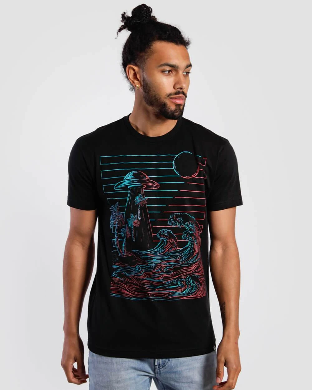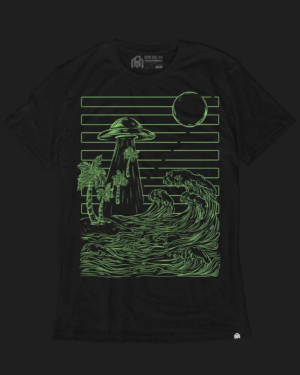 Surf, sun and swaying palms. These interstellar travelers are hoping to bring some beach vibes back home and there are no tourist shops on this island. So in the UFO they go in our original Unnatural Forces Glow-in-the-Dark design on a premium ultra-soft men’s black t-shirt.